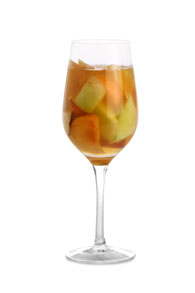 Comece cotando a laranja em fatias finas e coloque-as em uma jarra e regue com o Marraschino e com o Grand Marnier. DAeixe em repouso por meia hora. Depois corte a pêra e os pêssegos descascados em cubos e coloque na jarra. Em seguida despeje o vinho sobre as frutas e misture delicadamente.